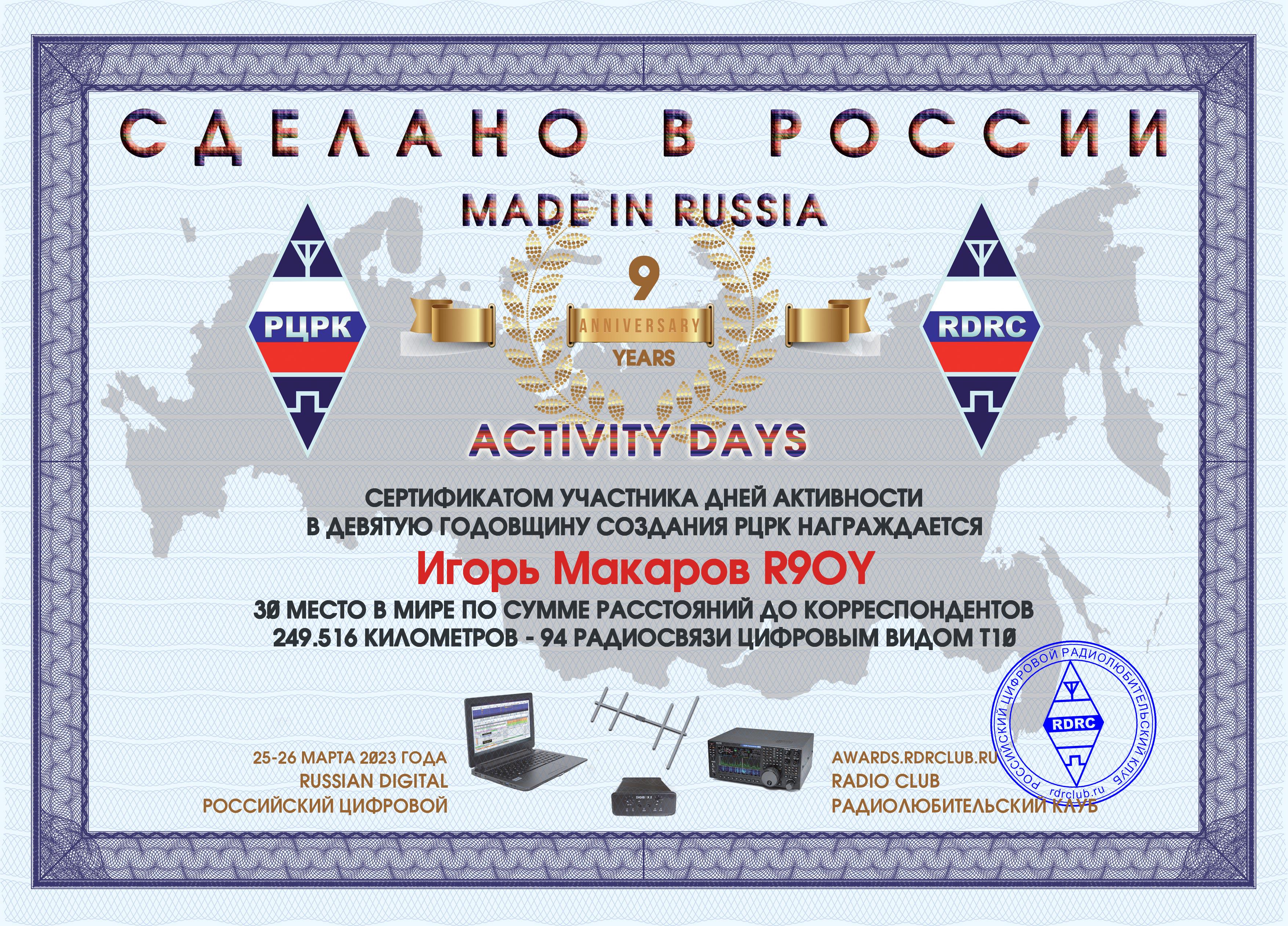 R9OY Certificate of participation Russia Call signs Award 2023 |