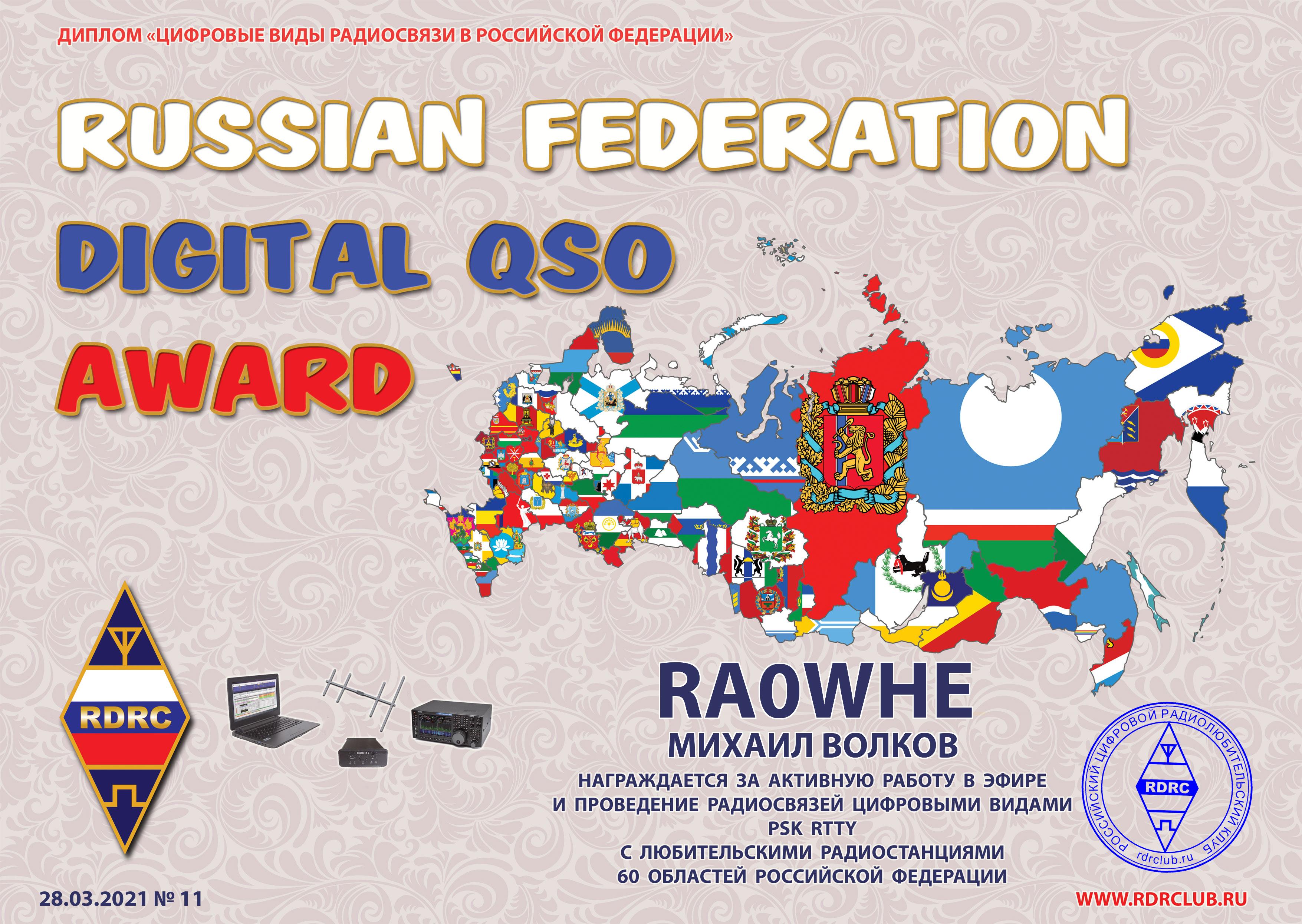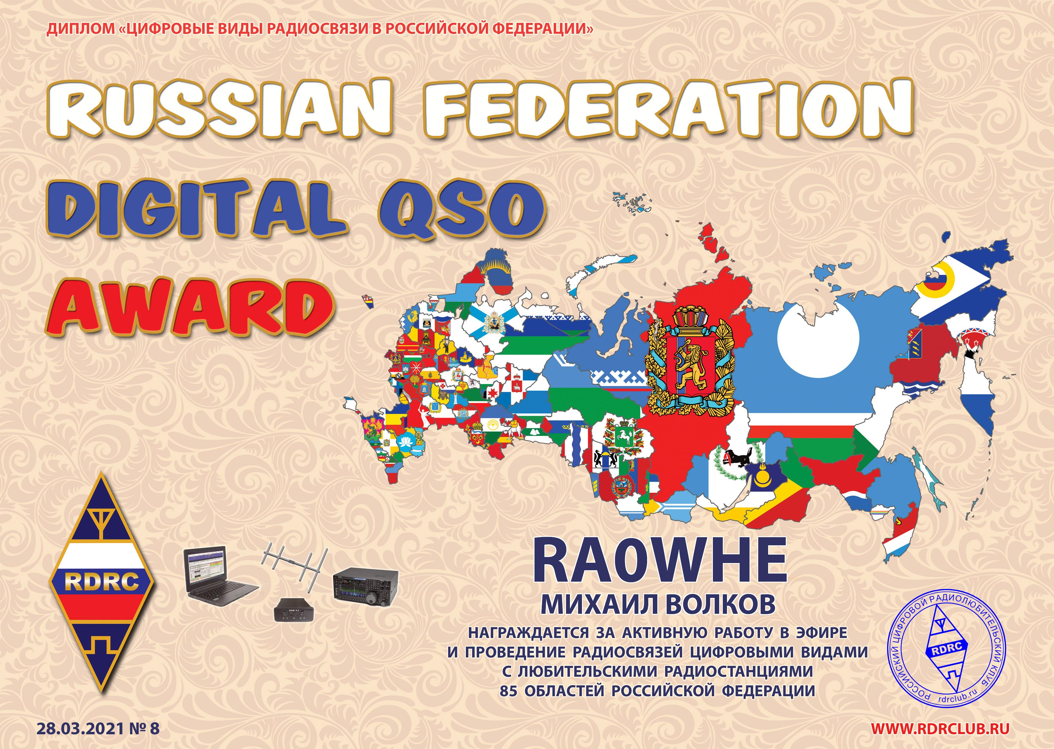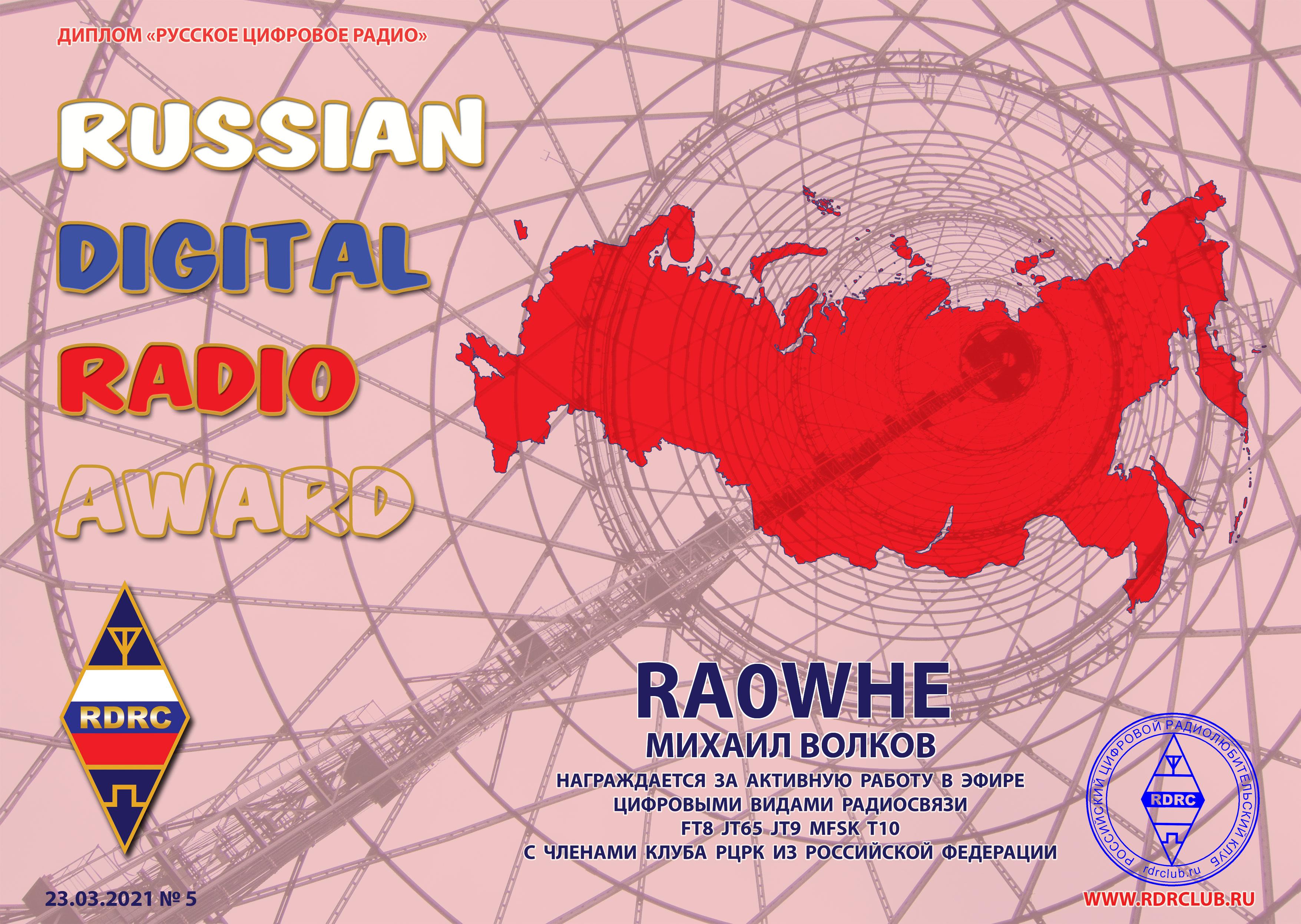RA0WHE Certificate of participation Amateur Digital Radio Award 2021 |