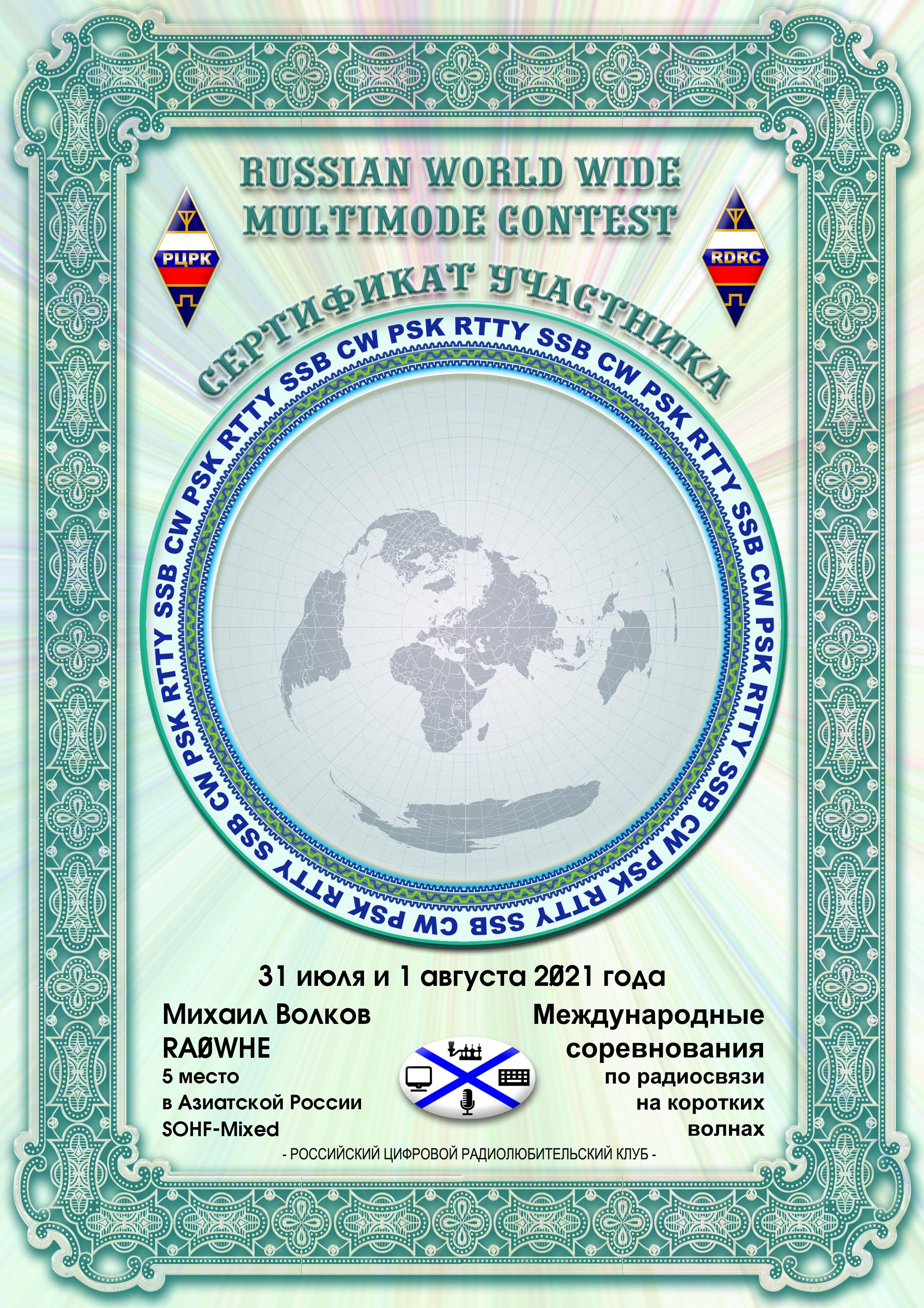 RA0WHE Certificate of participation RUSSIAN WW MULTIMODE CONTEST 2021 |