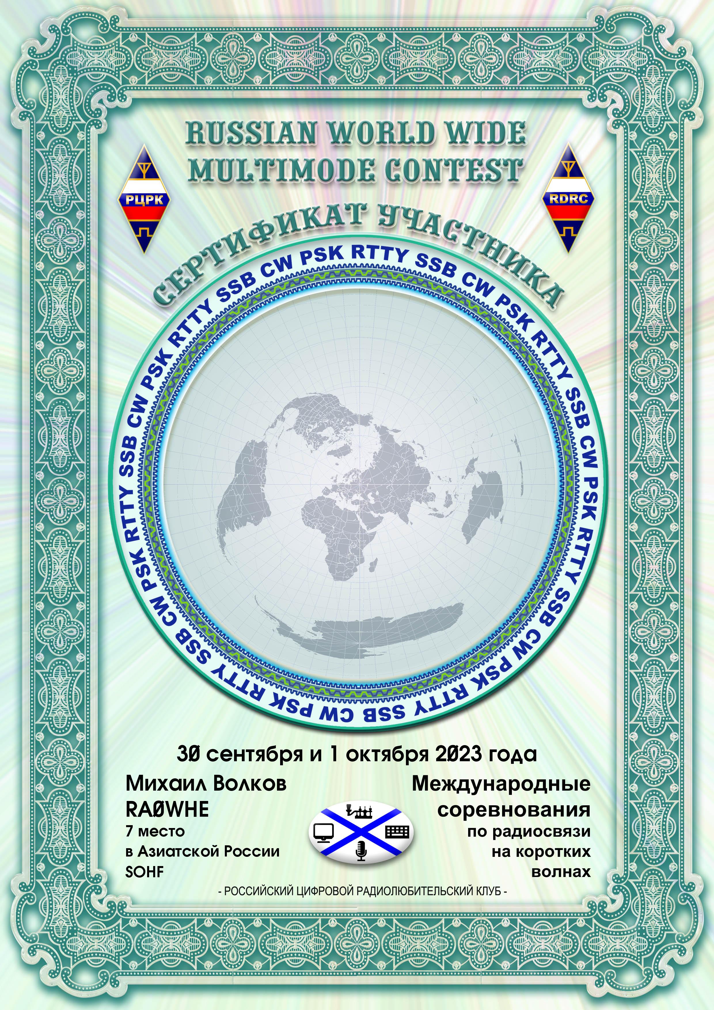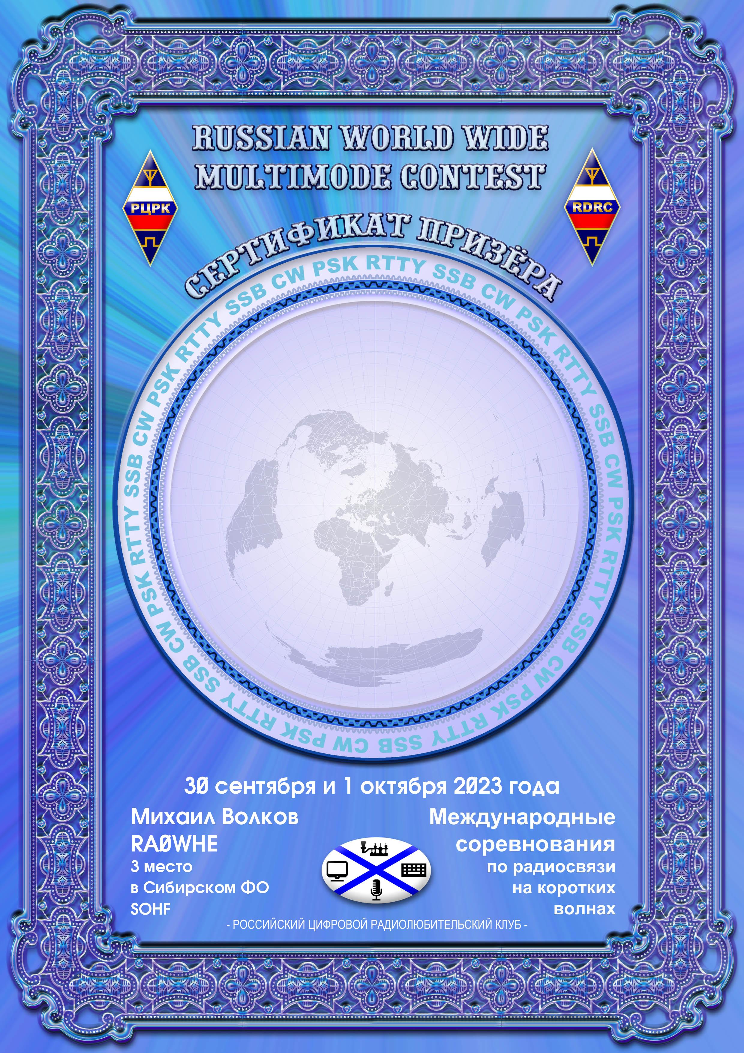RA0WHE Prizewinner Certificate RUSSIAN WW MULTIMODE CONTEST 2023 |