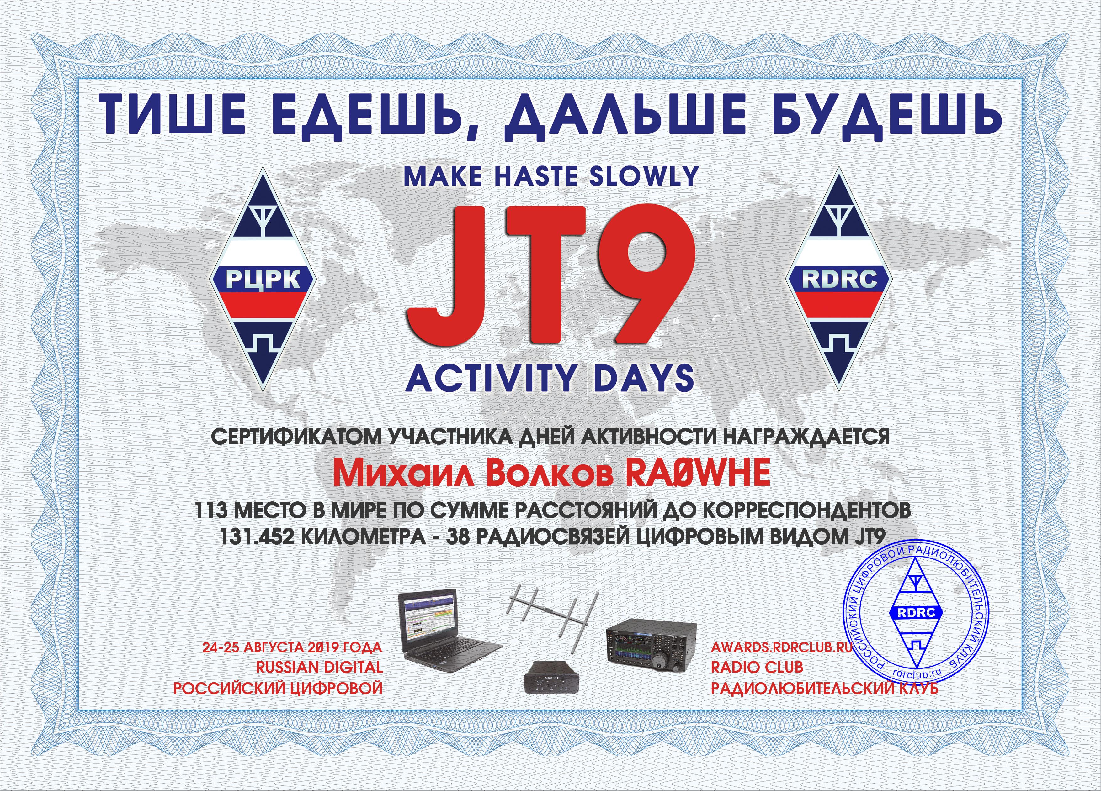 RA0WHE Certificate of participation JT9 MAKE HASTE SLOWLY 2019 |