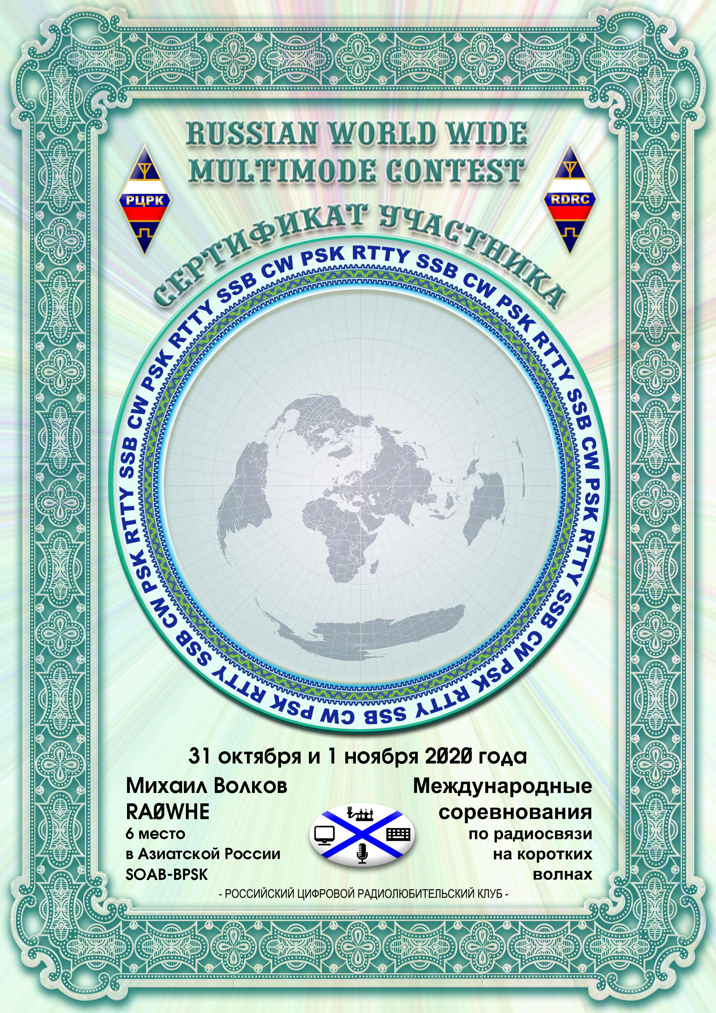 RA0WHE Certificate of participation RUSSIAN WW MULTIMODE CONTEST 2020 |