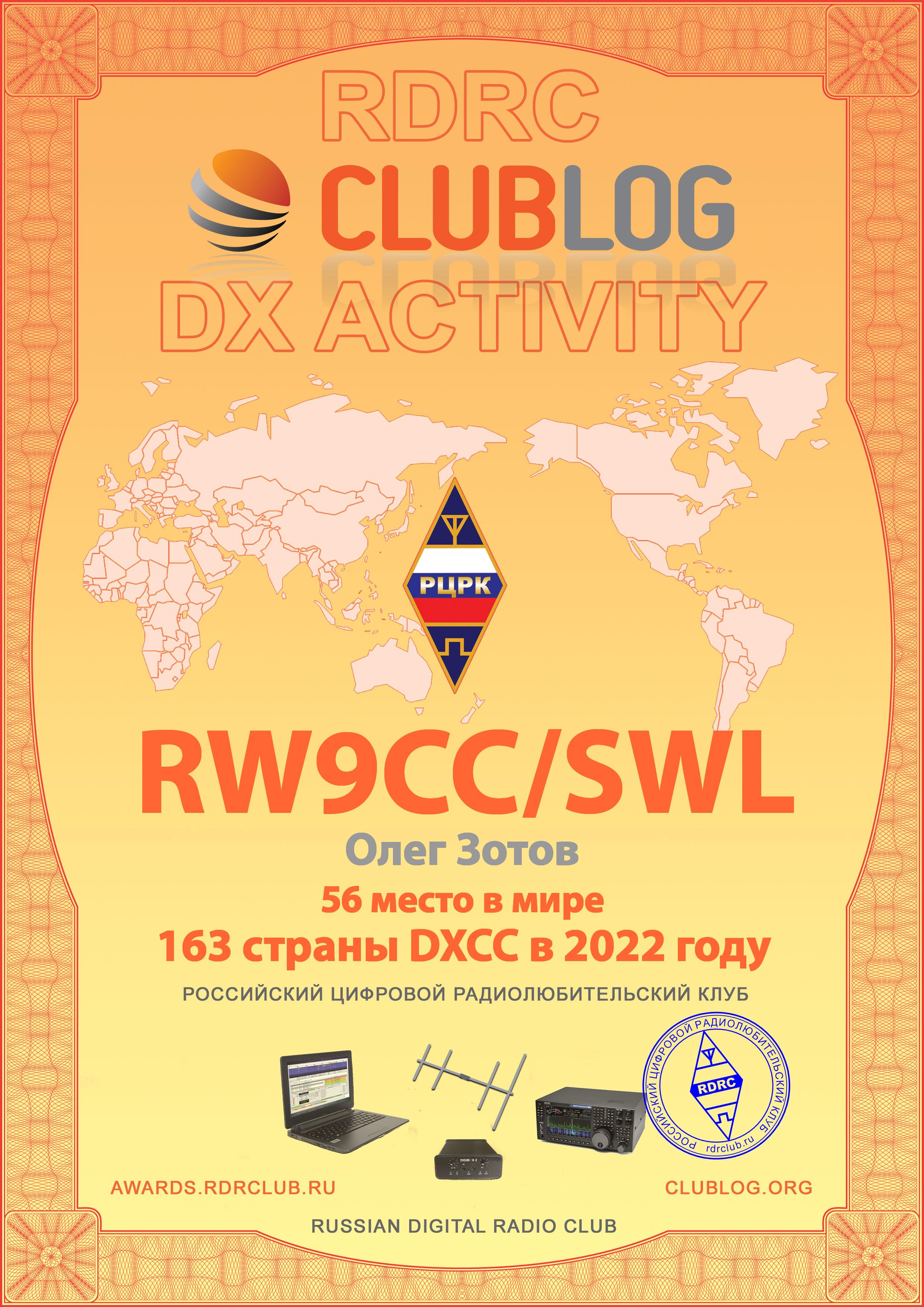 RW9CC Certificate of participation CLUBLOG DX ACTIVITY 2022 |