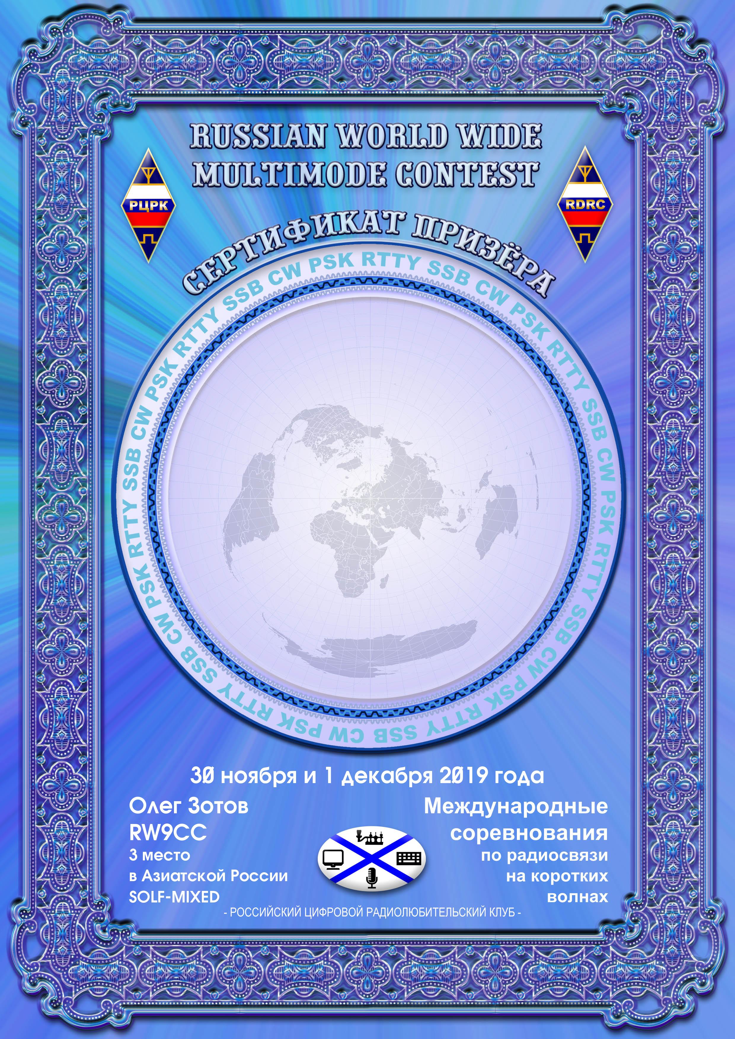 RW9CC Prizewinner Certificate RUSSIAN WW MULTIMODE CONTEST 2019 |