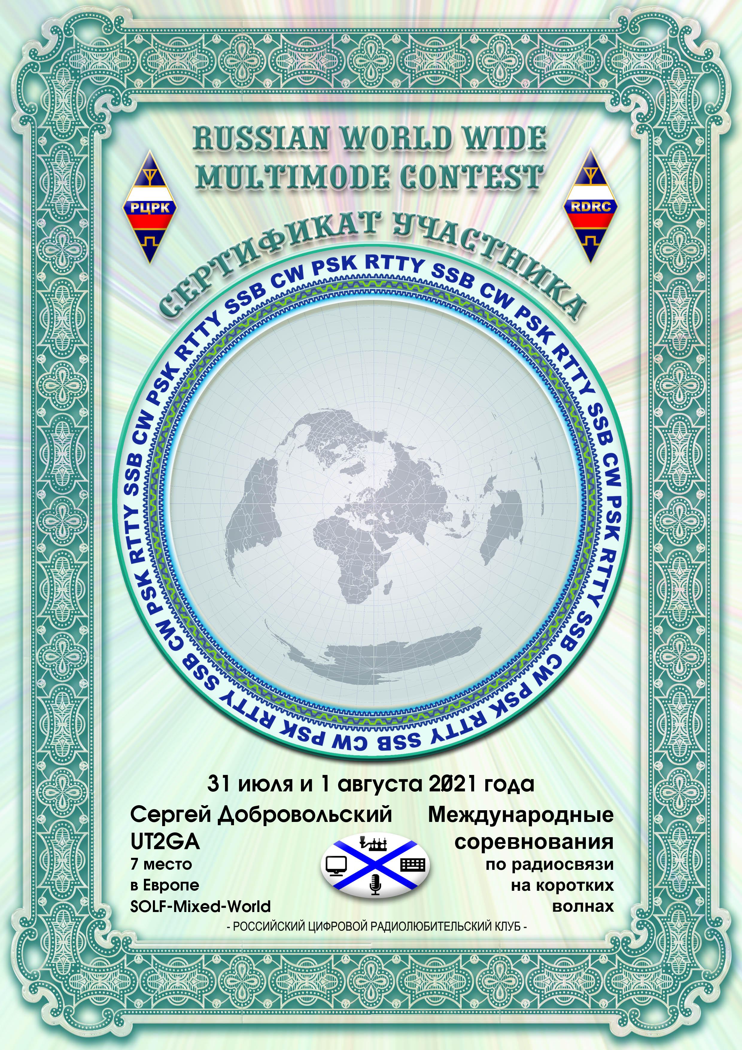 UT2GA Certificate of participation RUSSIAN WW MULTIMODE CONTEST 2021 |