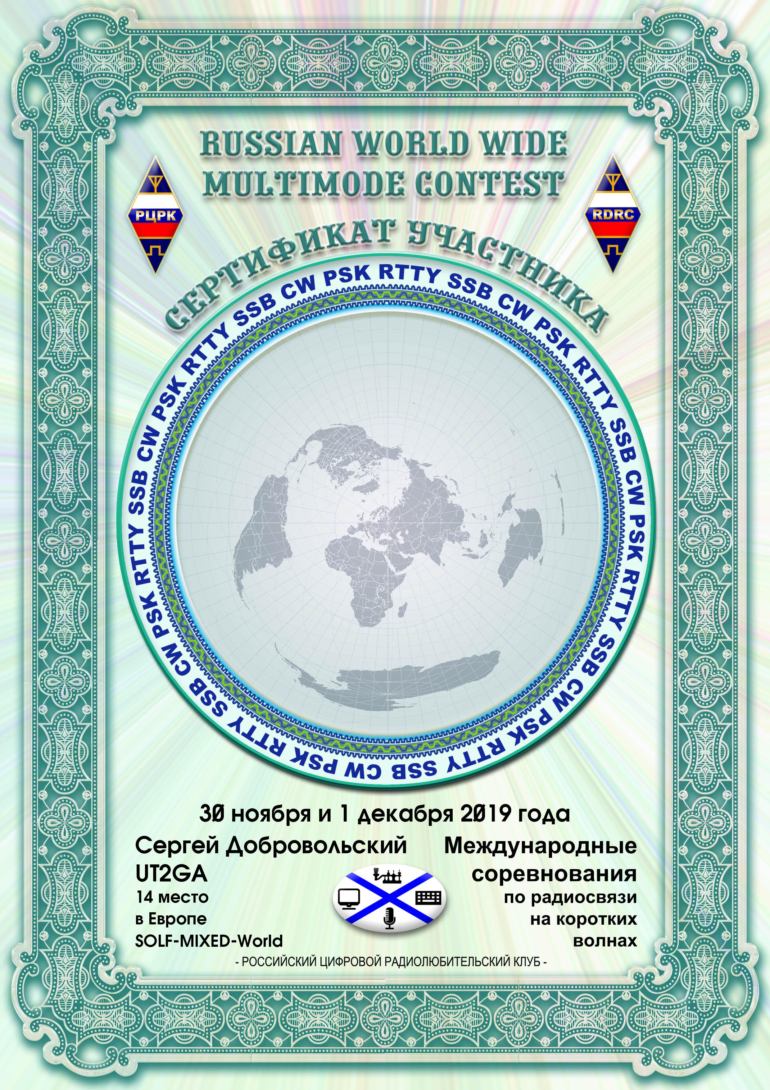 UT2GA Certificate of participation RUSSIAN WW MULTIMODE CONTEST 2019 |