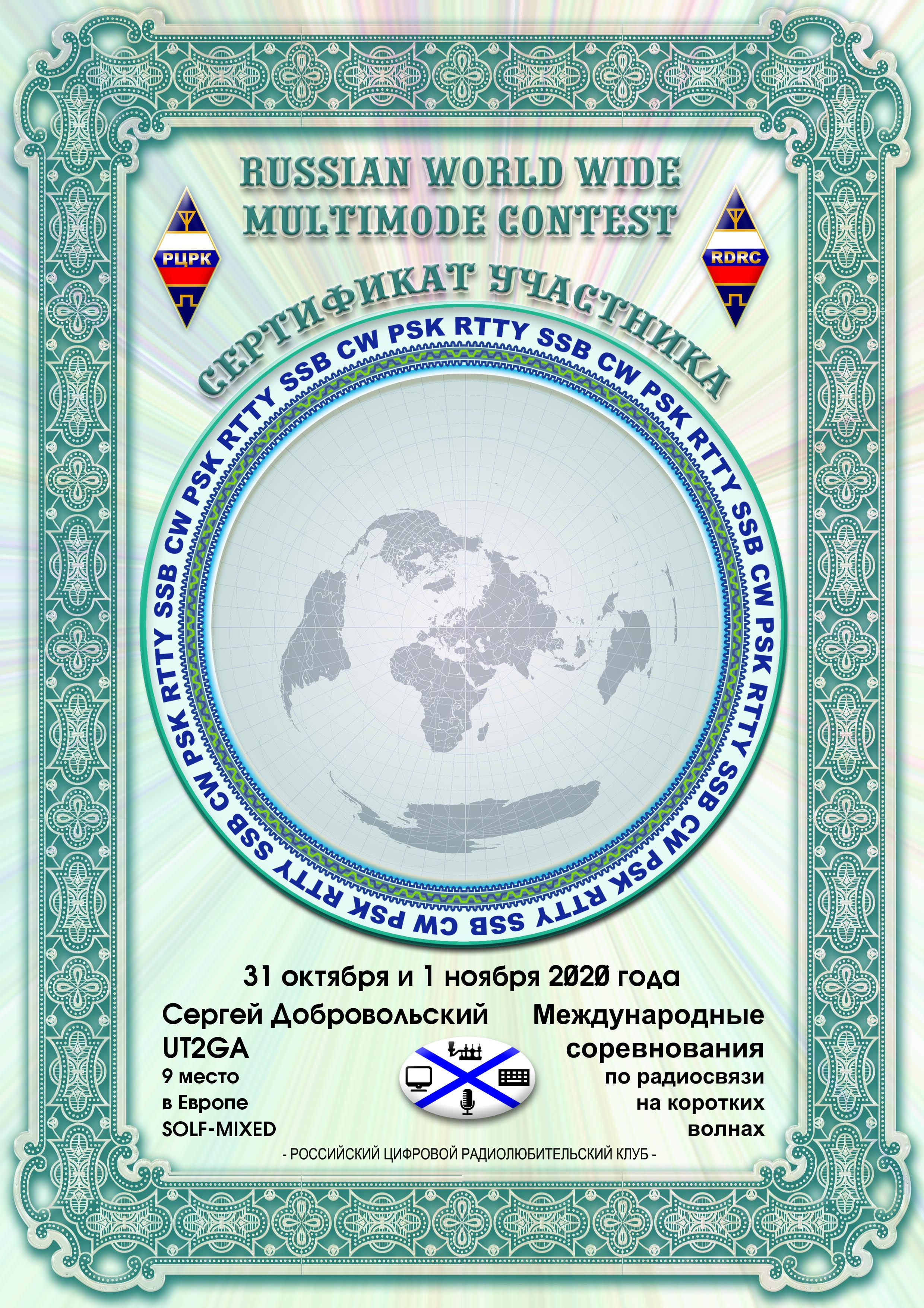 UT2GA Certificate of participation RUSSIAN WW MULTIMODE CONTEST 2020 |
