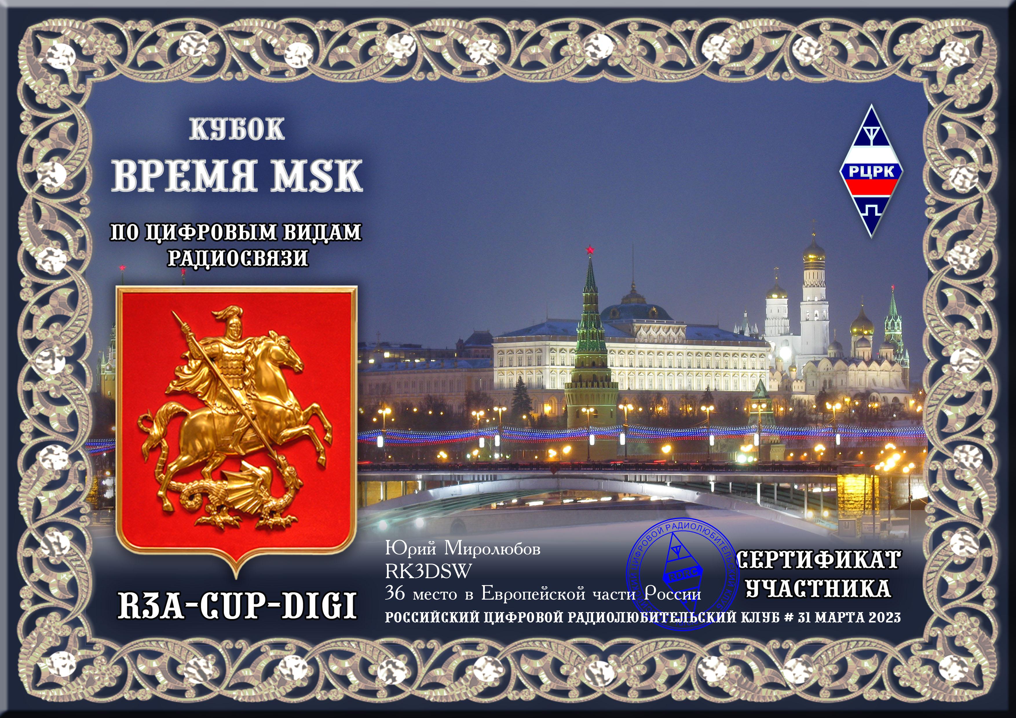 RK3DSW Certificate of participation RTTY Cup of "MSK TIME" 2023 |
